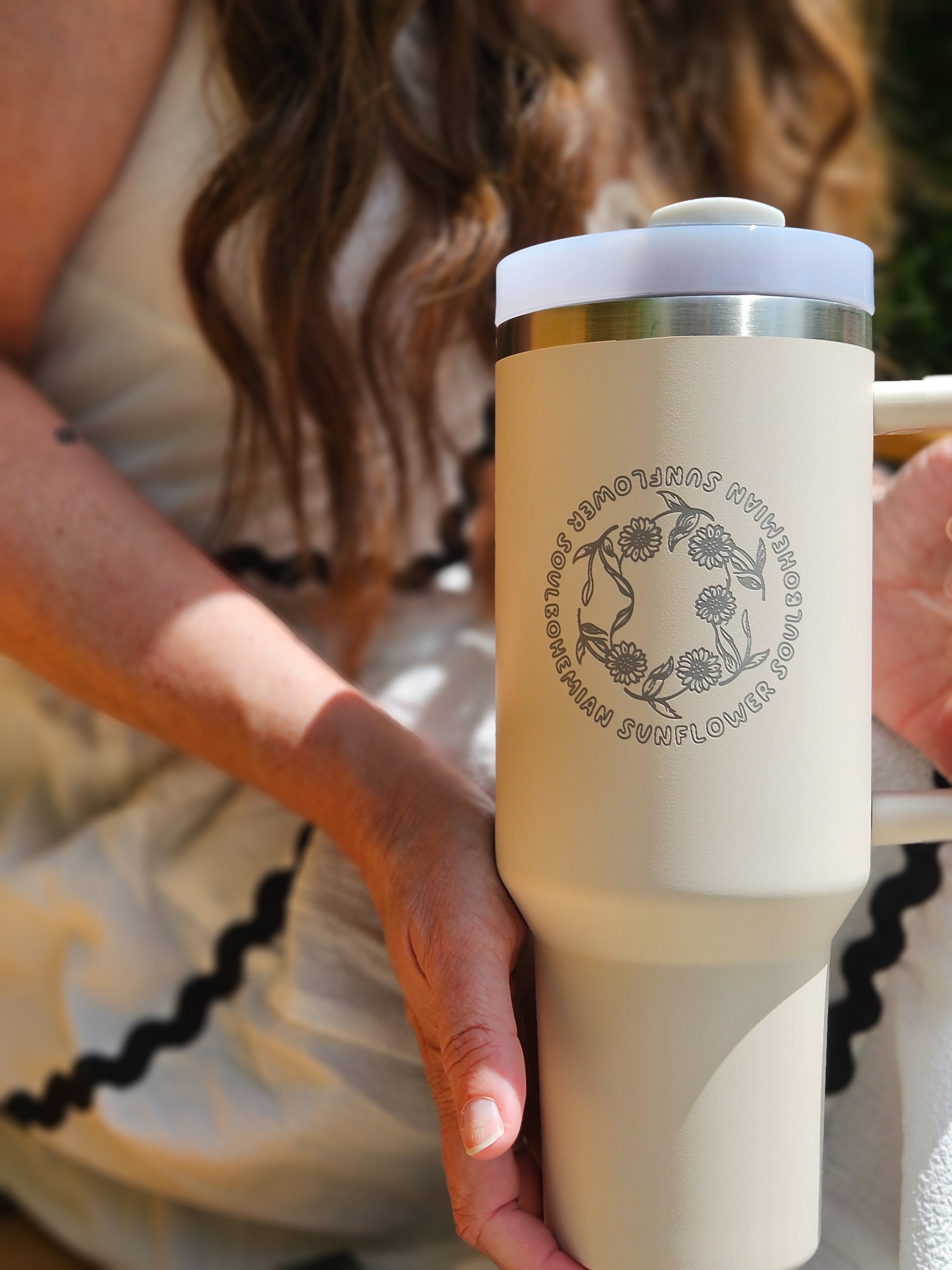 🔆 Each tumbler is laser engraved with my free-spirit, *Bohemian Sunflower Soul* logo.