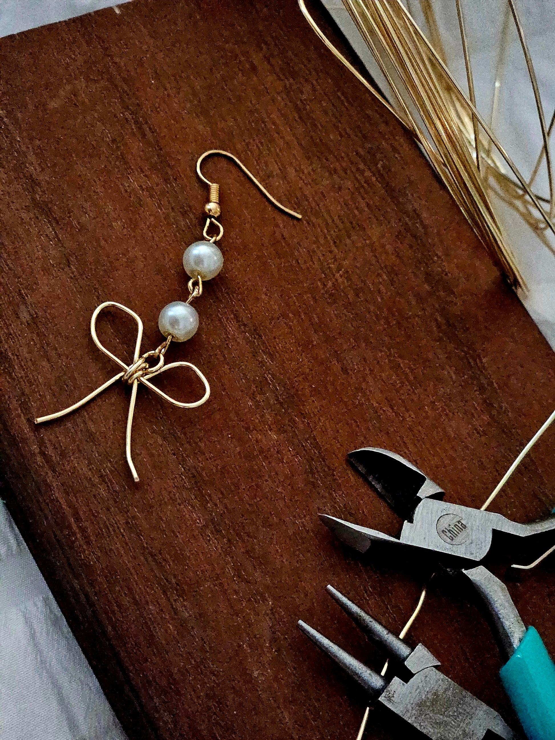 🔆 Earrings - Gold bows, handcrafted with wire, so each pair is unique & different. Accented with faux pearlized beads.